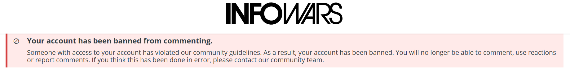 I used to follow and read Alex Jones's website, infowars.com. I only ever commented on 1 post on his site, and was immediately banned from ever commenting again. At this point, I don't even remember what I said, it was benign, I'm sure, yet before my comment was ever posted, their online review committee blocked and banned me. It feels like the Gestapo has taken over at Jones' site. Let's keep in mind, the deep state has been doing this to him, violating his 1st amendment rights for decades. Yet one of his followers, who said nothing wrong, and cannot even appeal the decision from being blocked, gets booted in a heartbeat.