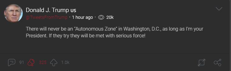 There will never be an "Autonomous Zone" in Washington, DC, as long as I'm your President. If they try they will be met with serious force!"